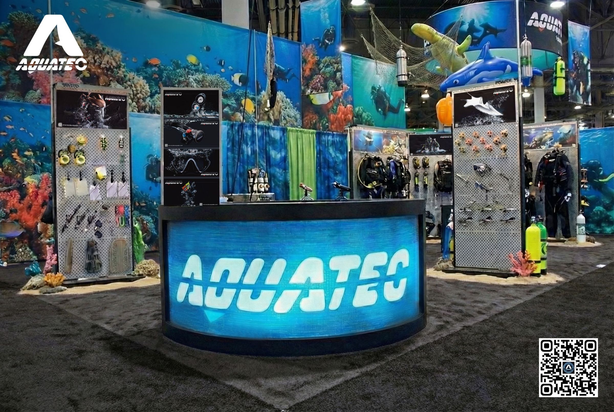 - Výstavní stánek Aquatec na DEMA Show s potápěčskými produkty a cedulí 'Hledáme distributora' pro globální partnerské příležitosti.