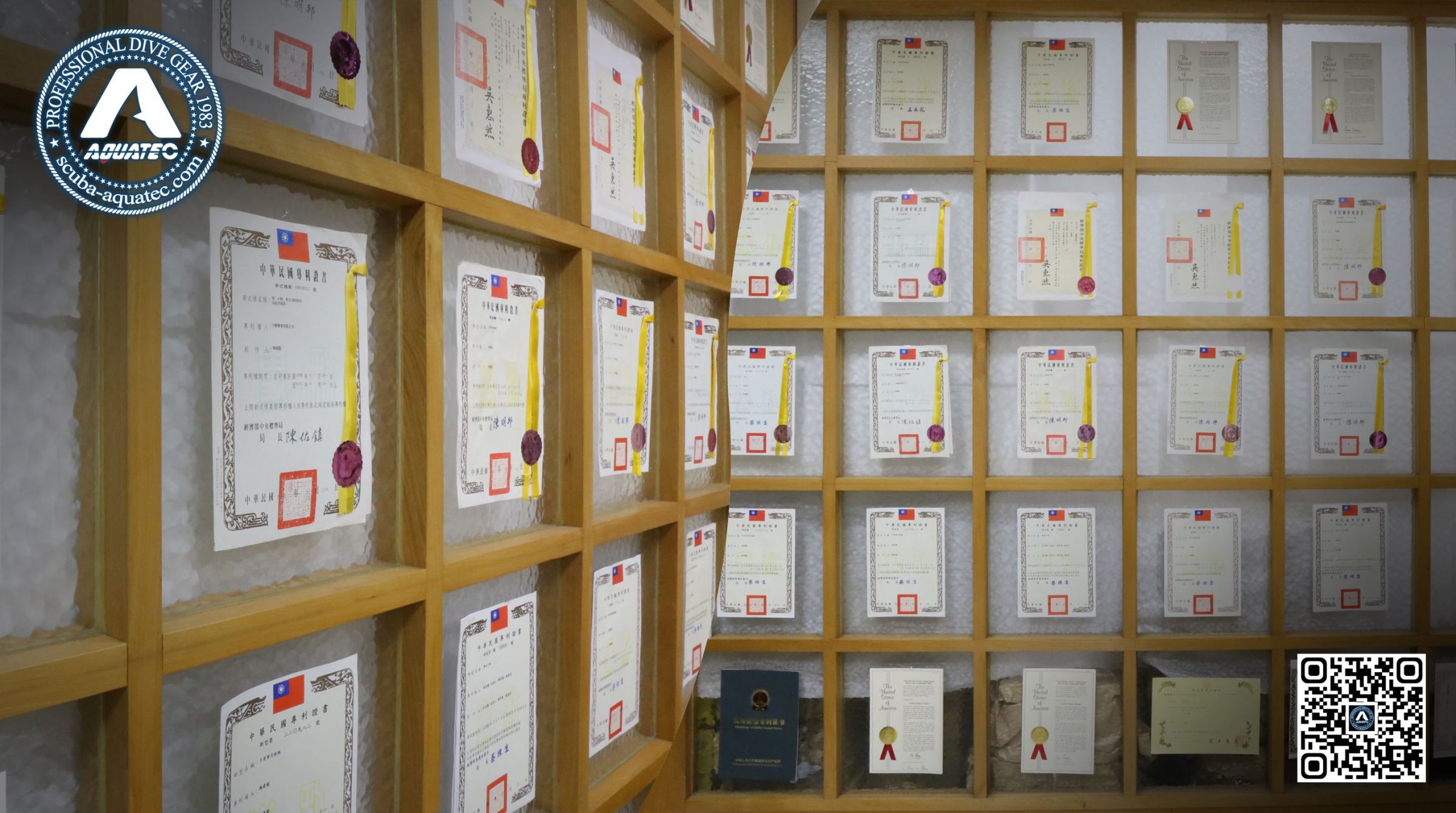 - Prezentace globálních patentů Aquatec a mezinárodních designových ocenění představujících inovace v technologii potápění.