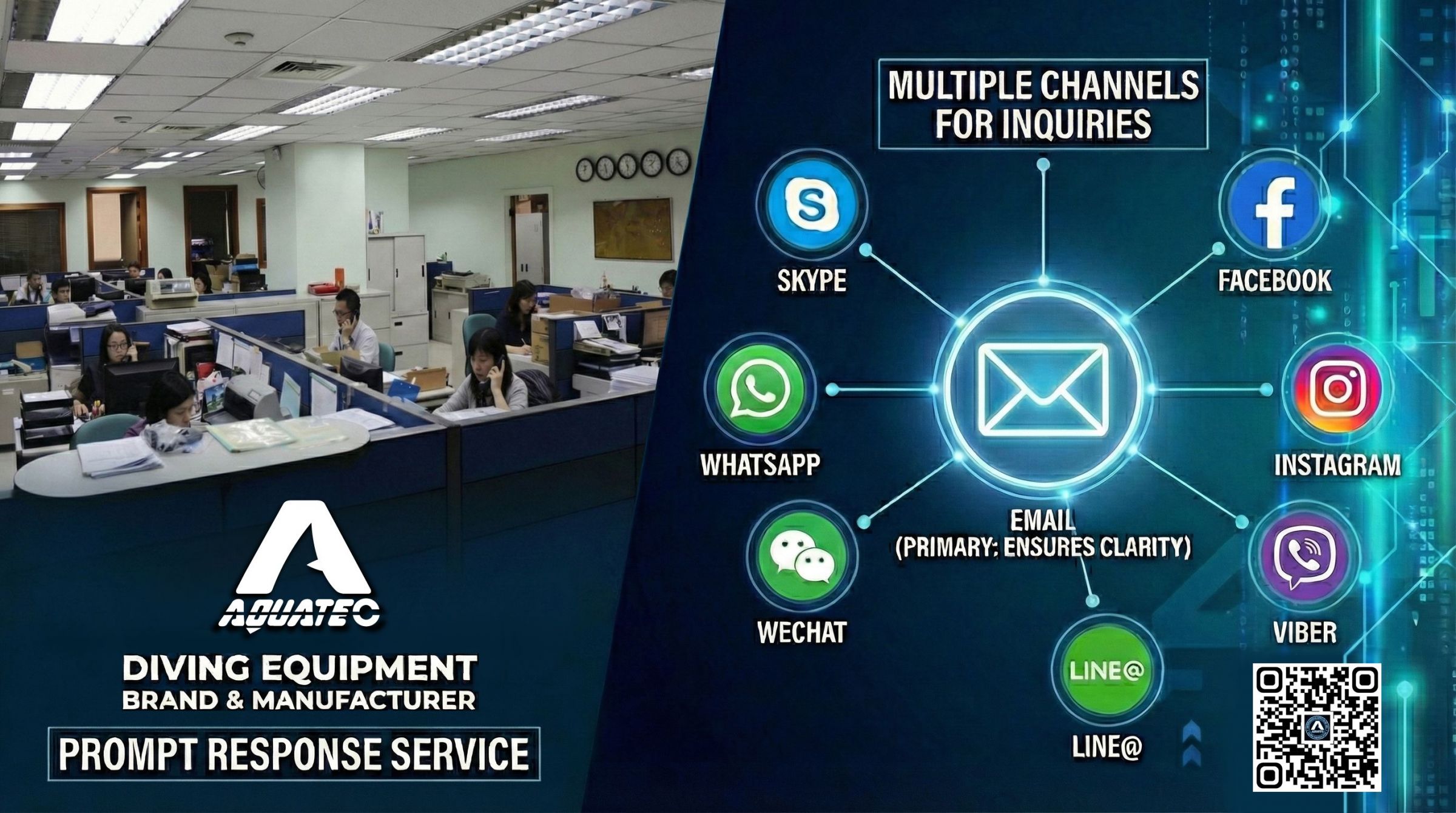 Chápeme, že čas jsou peníze. AQUATEC se zavazuje reagovat na problémy s produkty nebo výrobou co nejdříve, aby se předešlo možným ztrátám. Naší primární metodou odpovědi je e-mail, abychom zajistili jasnost, ale také zpracováváme dotazy prostřednictvím několika kanálů, včetně telefonních hovorů, Skypu, Facebooku, Instagramu, WeChatu, Line@ a WhatsAppu.