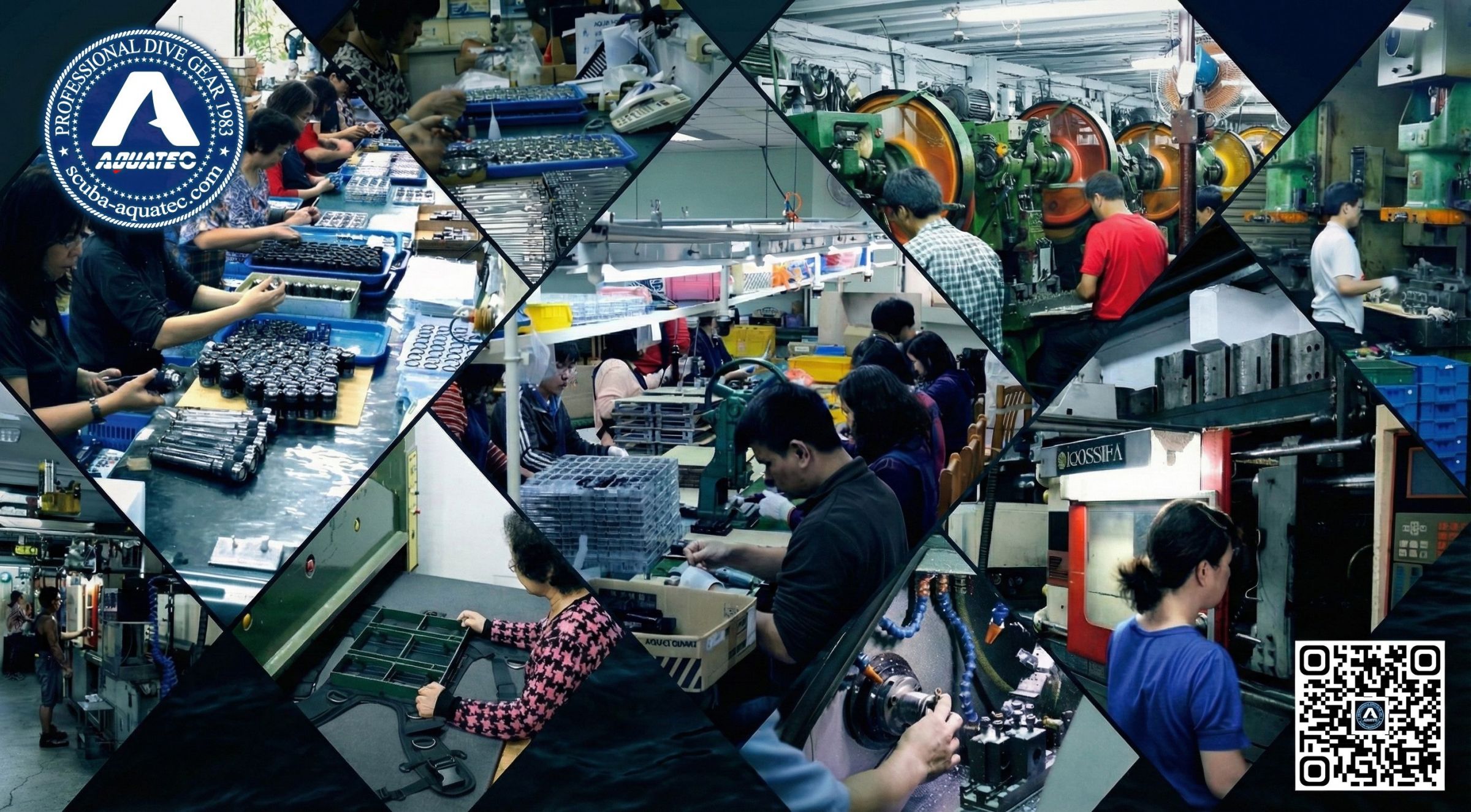 - Kombinovaný pohled na výrobní zařízení Aquatec na Taiwanu, včetně CNC obrábění, vstřikování plastů, hydraulického razení a šicích montážních linek.