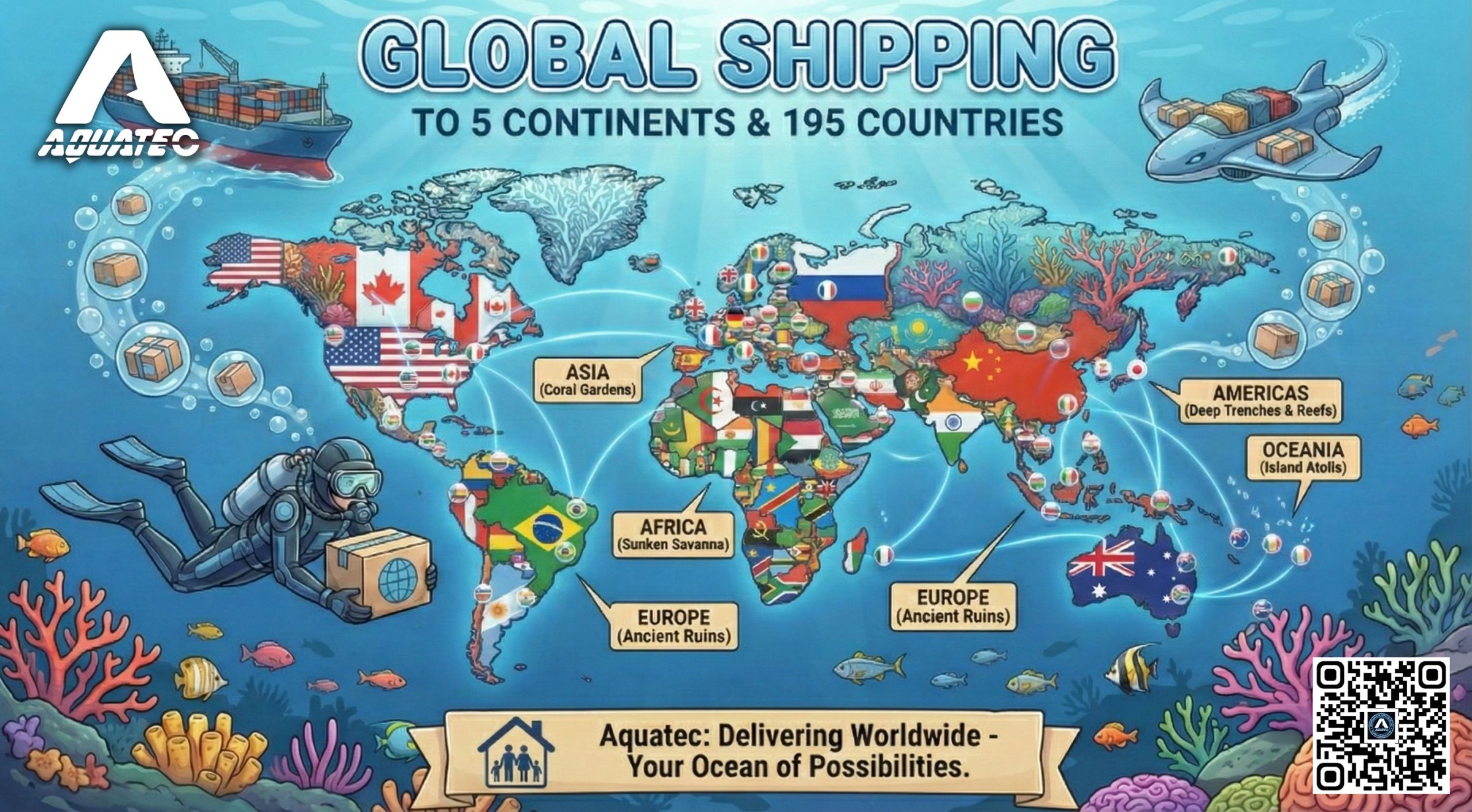 شبکه لجستیک جهانی بدون درز SCUBA AQUATEC را کشف کنید. به عنوان یک تولیدکننده برتر تایوان، ما تجهیزات غواصی حرفهای را به بیش از 195 کشور در 5 قاره ارائه میدهیم. ما شرایط تحویل انعطافپذیر (EXW، FOB، CIF) و راهحلهای حمل و نقل سفارشی—from پست سریع تا حمل و نقل دریایی—را ارائه میدهیم و اطمینان میدهیم که تجهیزات شما بهطور ایمن و بهموقع به دستتان میرسد.