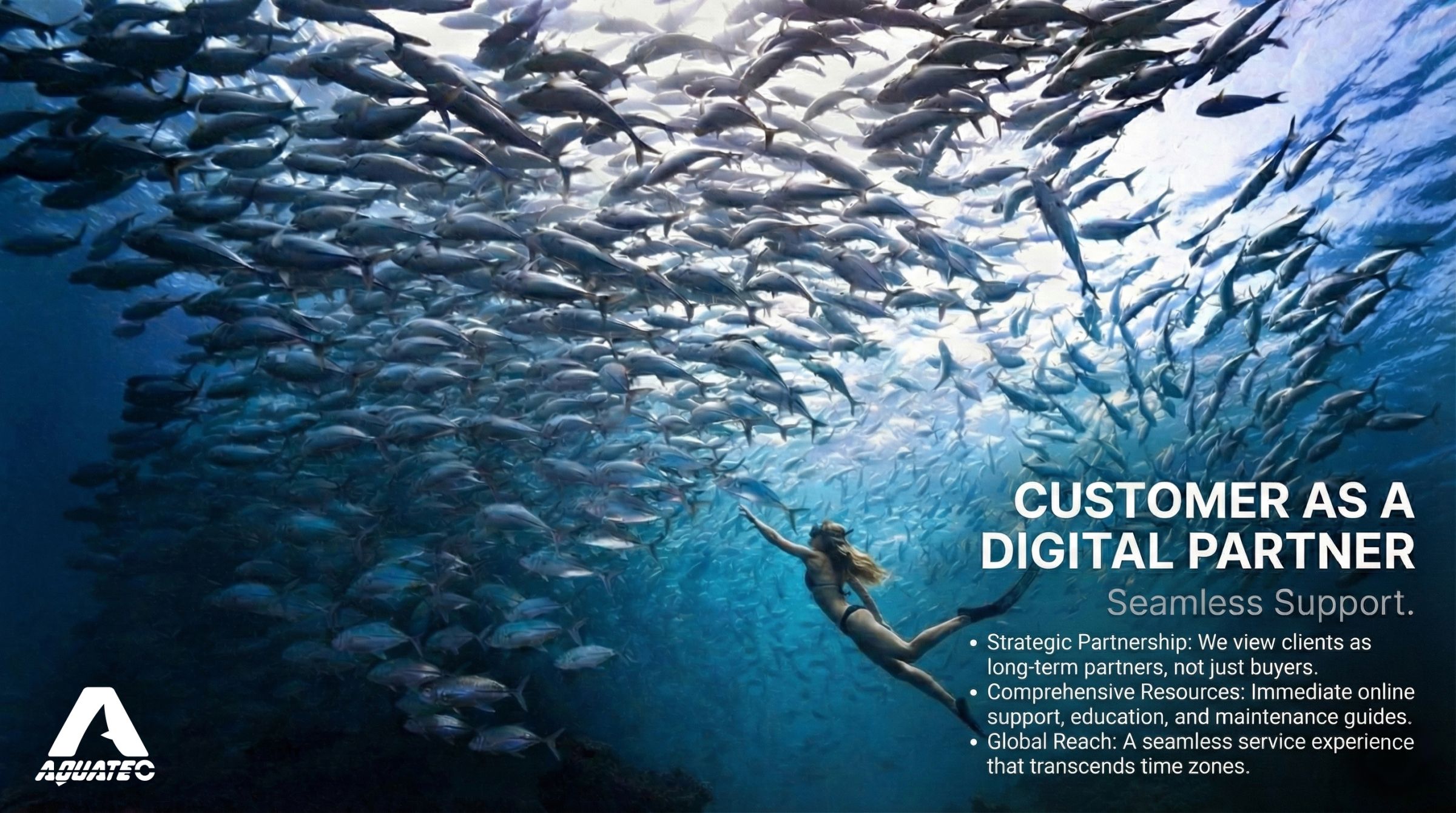 Bedriftskultur: Integritet, Mot og Digital Tilkobling. AQUATECs kultur er basert på Integritet, Mot og Teamarbeid. Vi omfavner en digital-først global strategi, og fungerer som et "365-dagers globalt utstillingsvindu." Våre kjerneverdier er definert av 5 søyler: 1. Intern F&U og Uopphørlig Innovasjon.