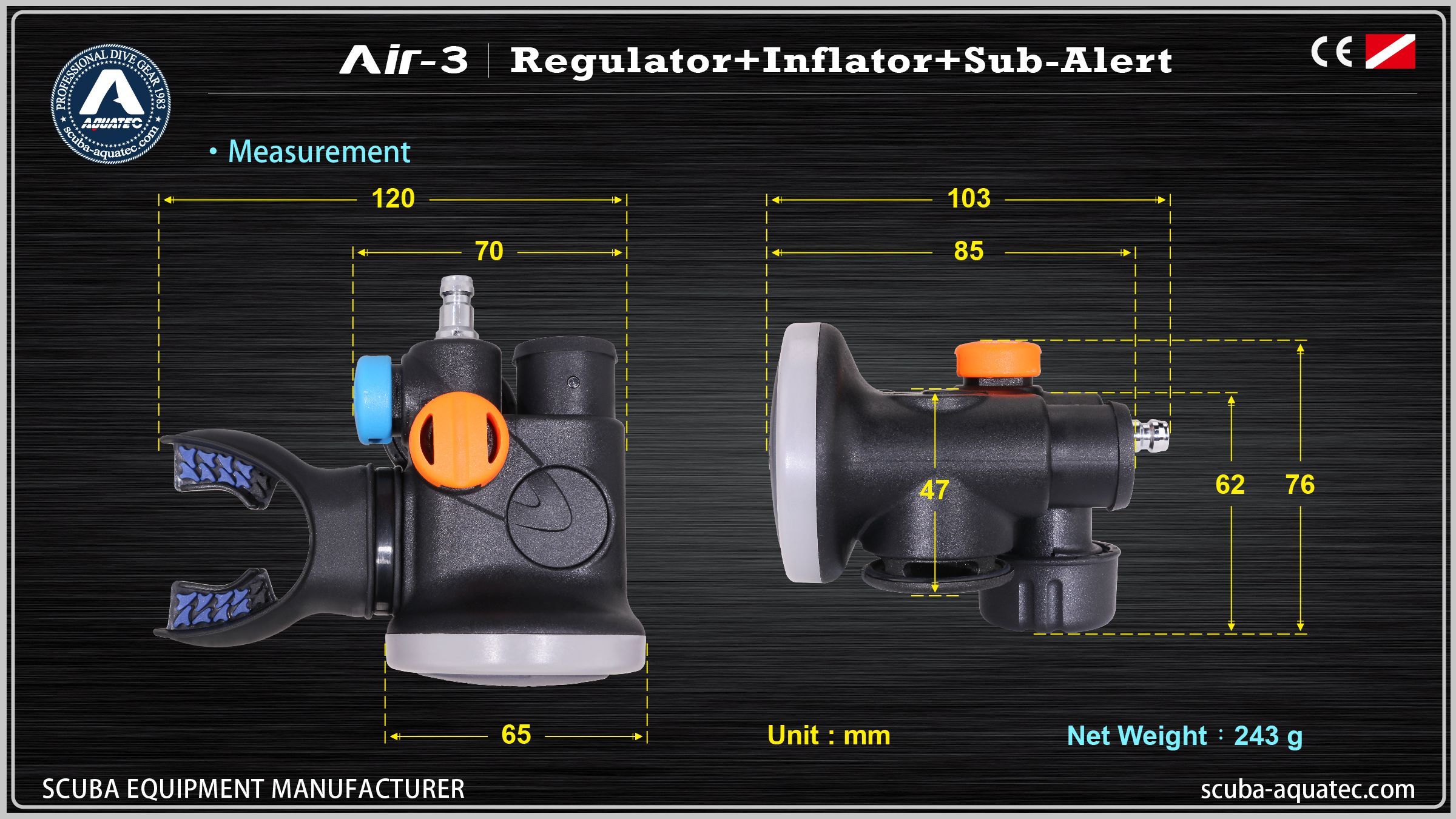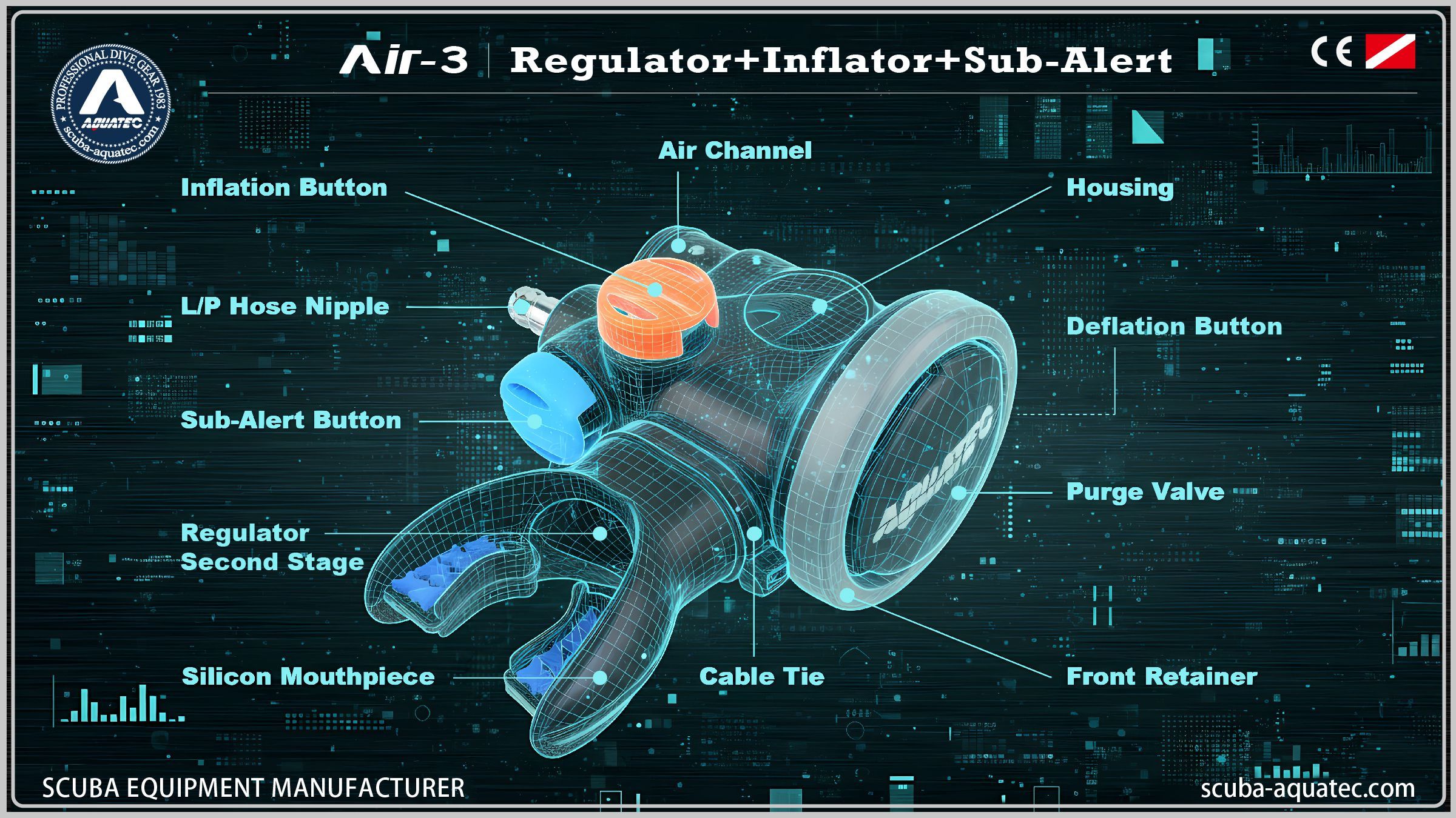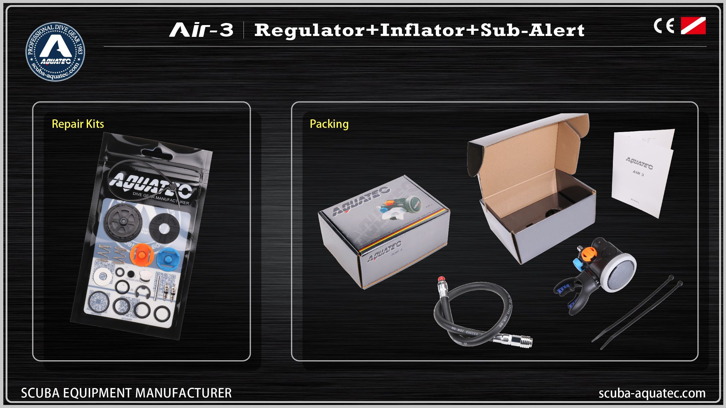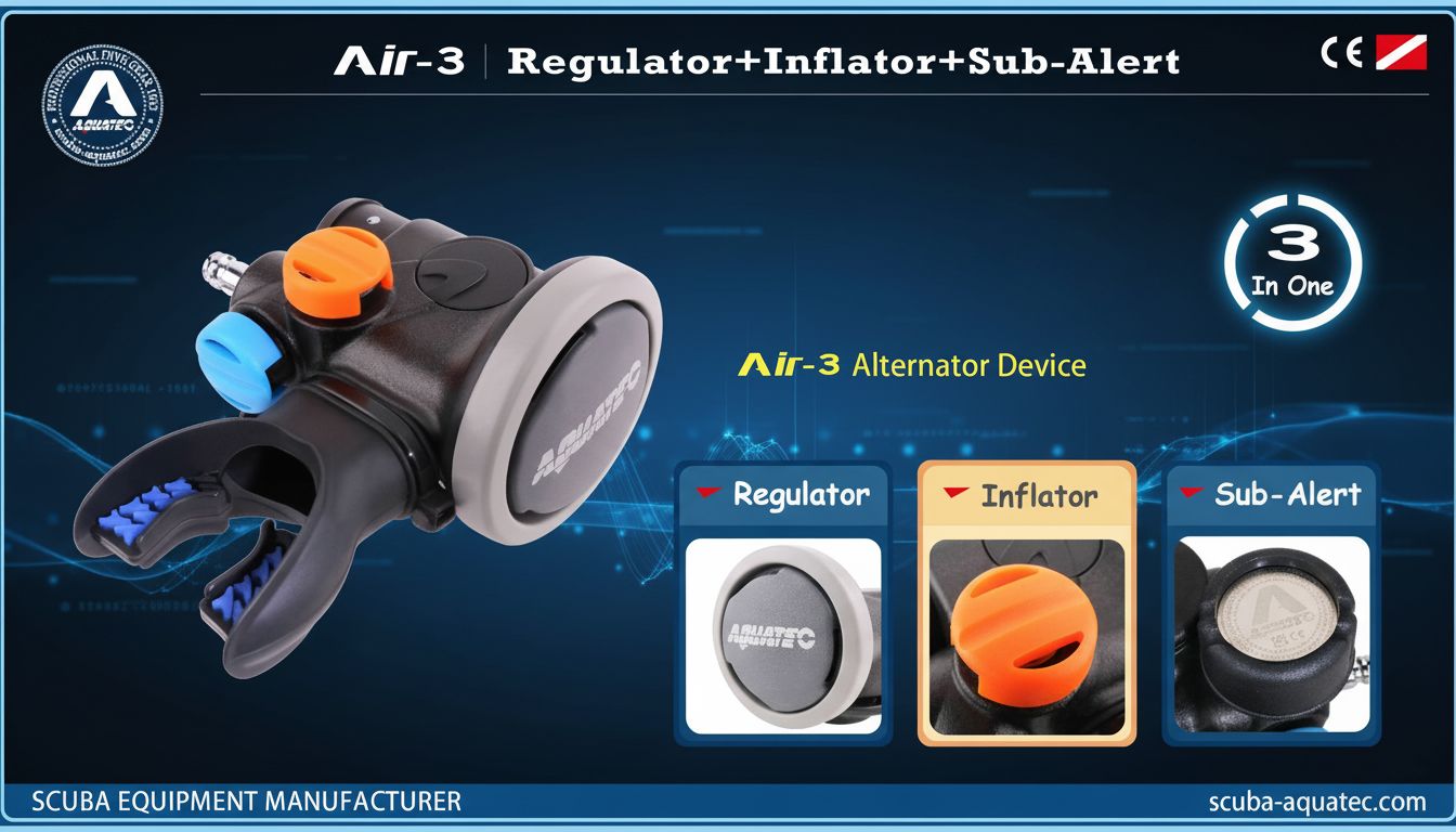 AQUATEC AIR-3, một bộ điều chỉnh tiên tiến, tích hợp Air-3 để dễ dàng tiếp cận khi lặn. Với các nút được mã hóa an toàn ở trên, nó phục vụ như một bộ điều chỉnh dự phòng ba trong một, có tính năng bộ điều chỉnh, van bơm, và còi báo động hai chức năng trên mặt nước và dưới nước, nổi bật với thiết kế đổi mới và các nút điều khiển thân thiện với người dùng.