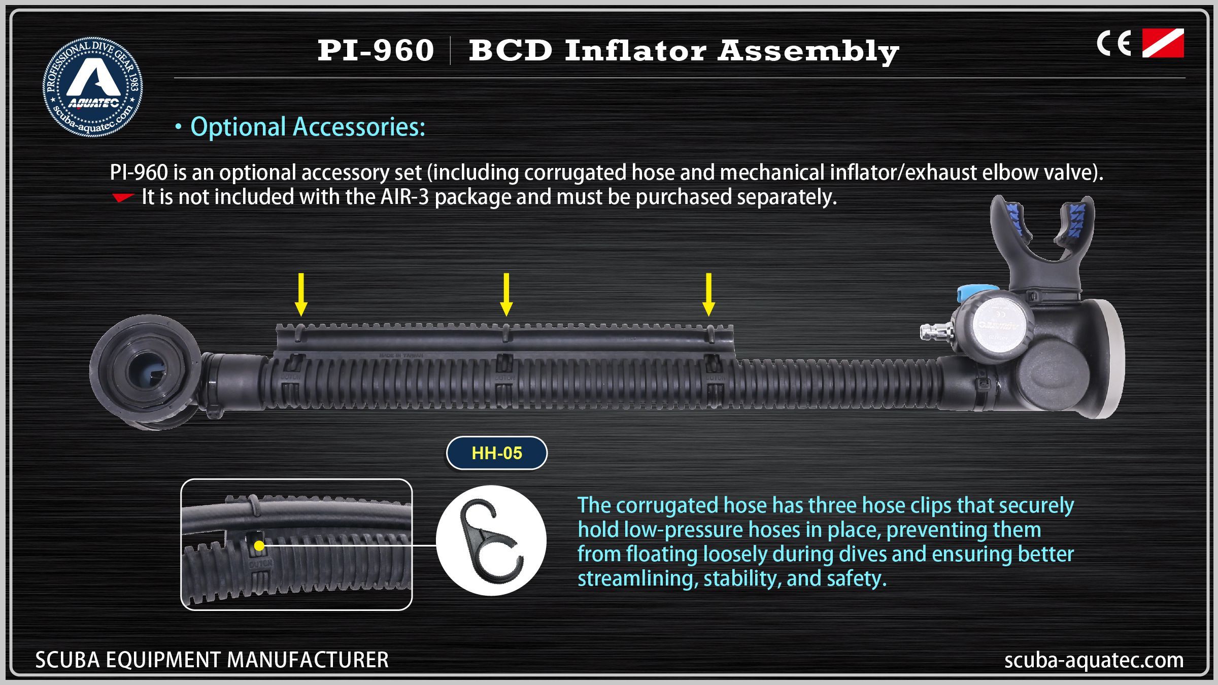 - Tính tương thích: Phù hợp với hầu hết các BC (trừ các mẫu của Aeris, Aqua-Lung, Cressi, Dacor, Oceanic, SeaQuest, TUSA với hệ thống bơm A.P.A. Active Purge Assist, US Divers và XS Scuba)